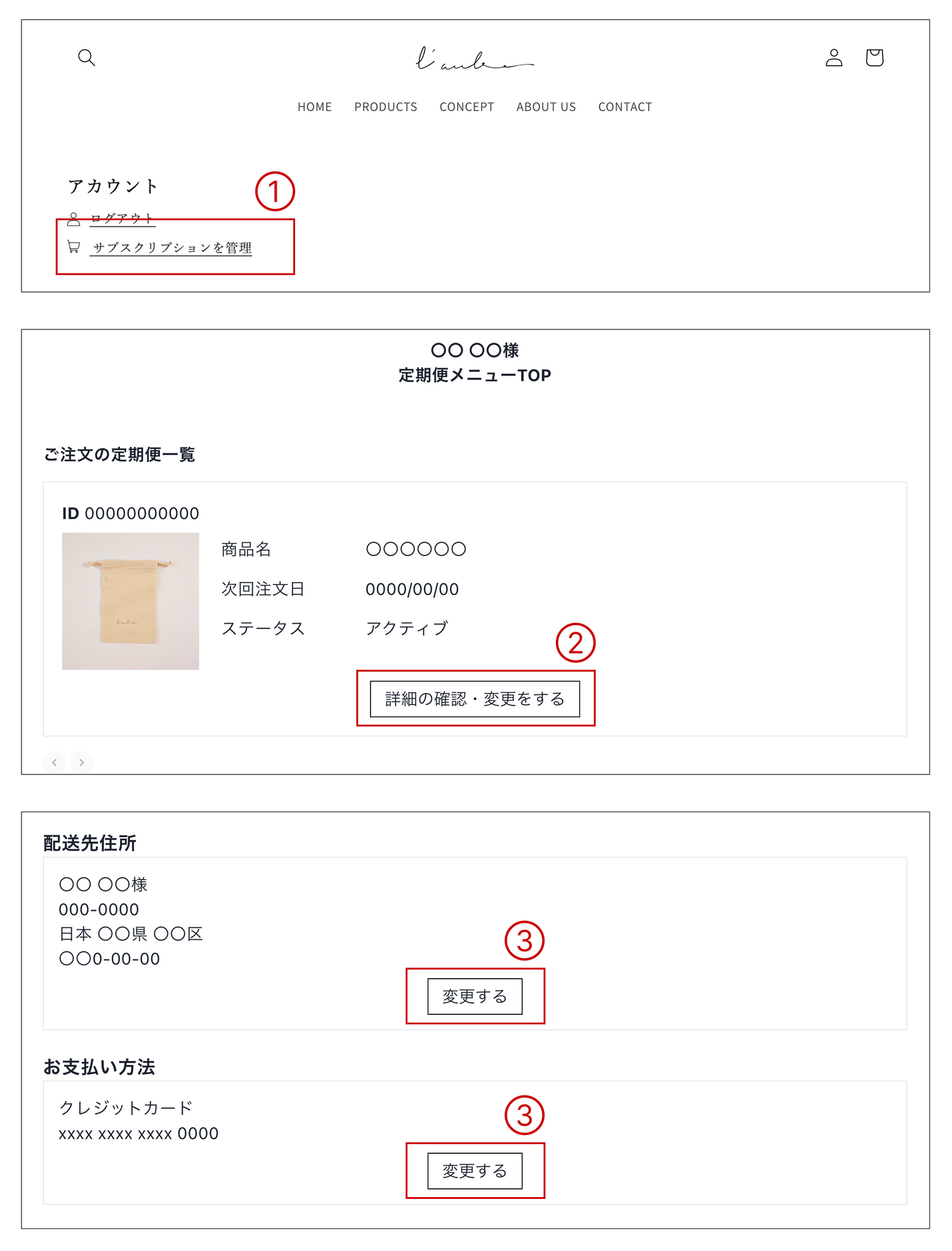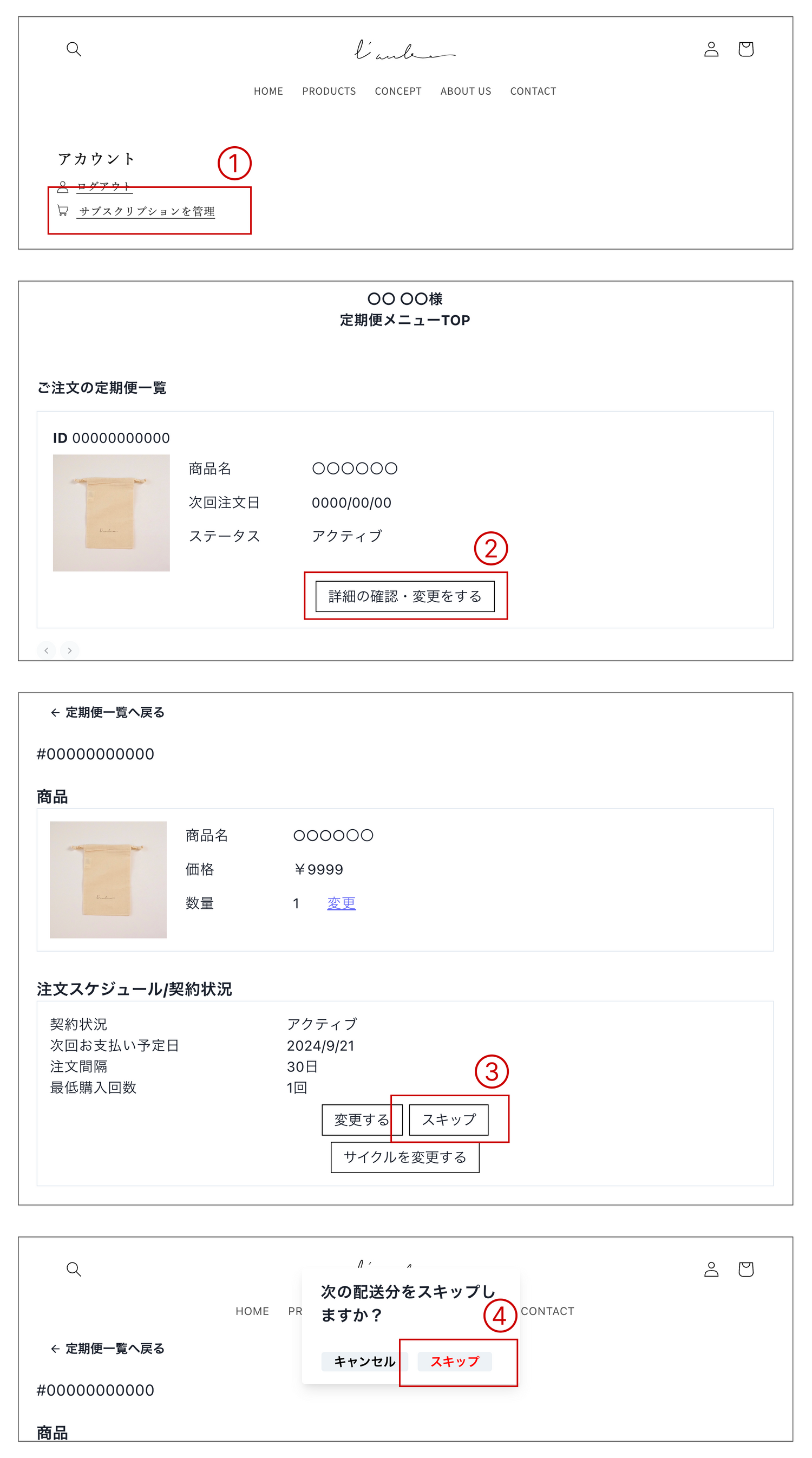 商品が余ってしまったり、長期的なご不在時の場合は定期商品のお届けを1回スキップすることができます。マイページの「サブスクリプションを管理」から設定いただけます。